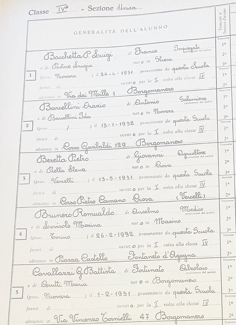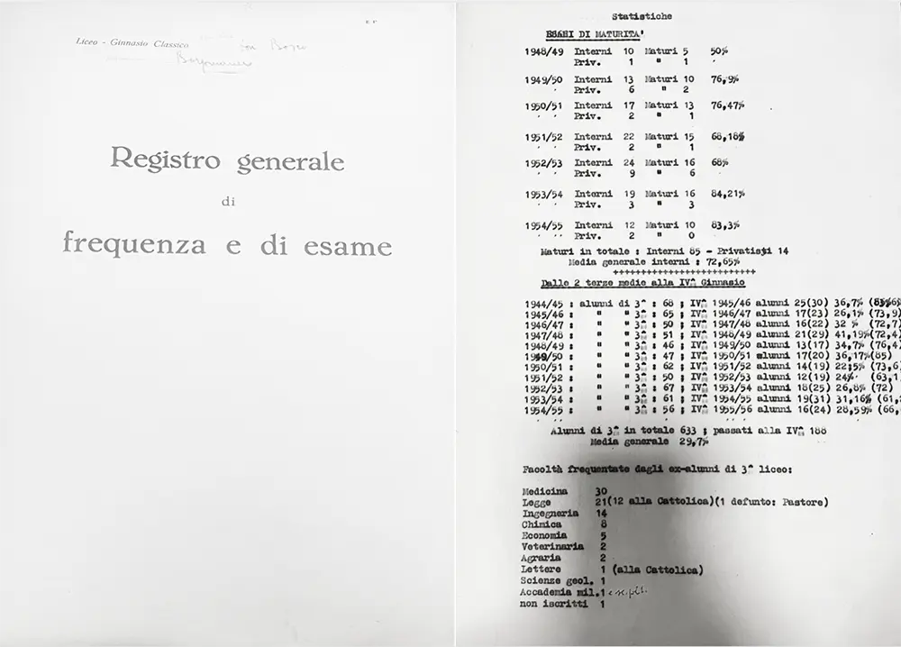 In questo momento di forte rilancio del nostro Liceo Classico, a settembre ricorrono gli 80 anni dall’avvio di questa scuola in città. Allora questa scuola era prevalentemente solo nei capoluoghi di provincia: obiettivo era avvicinarla ad un territorio che si preparava al rilancio del Dopoguerra. Fu una importante intuizione: si partì sia con la Quarta Ginnasio (composta in prevalenza da ragazzi “interni” che avevano concluso la Terza Media), sia con la Quinta Ginnasio e la Prima Liceo Classico. Si ampliò il “Collegio” anche a chi aveva frequentano in altre città i primi anni del Classico e grazie al don Bosco si avvicinava a casa. Solo maschi gli iscritti, solo Salesiani i docenti. Registri cartacei e scritti a mano, con una cura (bella calligrafia a pennino) ed una precisione d’altri tempi. Ma altrettanto attenta la gestione dei dati. Si riporta un foglio battuto a macchina da scrivere, in cui sono indicate le immatricolazioni dei primi diplomati alle varie facoltà: stava nascendo parte della nuova classe dirigente del nostro territorio, che divennero poi imprenditori di successo, affermati professionisti e impeccabili dirigenti.