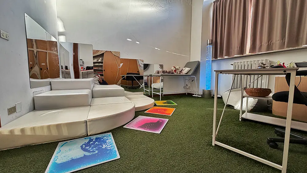 Nell’immagine una “chill-out zone” di accoglienza, uno spazio pensato per offrire agli studenti in difficoltà un contesto protetto, rassicurante e non stigmatizzante. Non si tratta di una semplice infermeria, ma di un ambiente educativo a bassa intensità, studiato per attenuare tensioni, stress e sovraccarico emotivo. Qui lo studente può essere accompagnato in momenti di fragilità, ritrovare equilibrio e prepararsi a rientrare gradualmente nella vita della classe grazie a una chill-out zone multisensoriale capace di aiutare a gestire ansia e stress, favorendo così anche la frequenza scolastica.