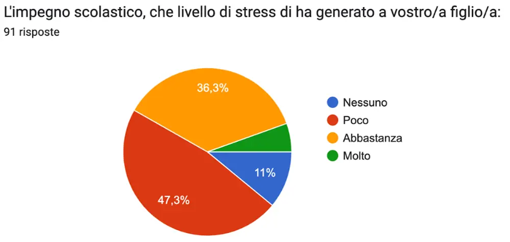 Anche lo stress generato è percepito in modo diverso: dai ragazzi, molto è indicato dal 17,6%, abbastanza dal 44,9% e poco dal 33,3%. I genitori segnalano invece un molto al 5,5%, un abbastanza al 36,3% ed un poco al 47,3%.