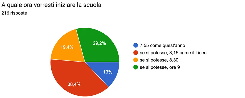 Rispetto al quadro orario, quello ideale secondo ragazze/i (65%) è quello con moduli da 55 minuti con un pomeriggio obbligatorio di lezione (due per la Linguistica), mentre per i genitori (55%) è quello con moduli da 50 minuti e con due pomeriggi di lezione (tre per la Linguistica). Anche le Prime Medie vorrebbero stare a mensa con tutti. Interessante l’ora di inizio della scuola: il 90% posticiperebbe quello attuale, allineandolo almeno come al liceo alle 8,15 e quasi un terzo vorrebbe cominciare alle nove le lezioni.