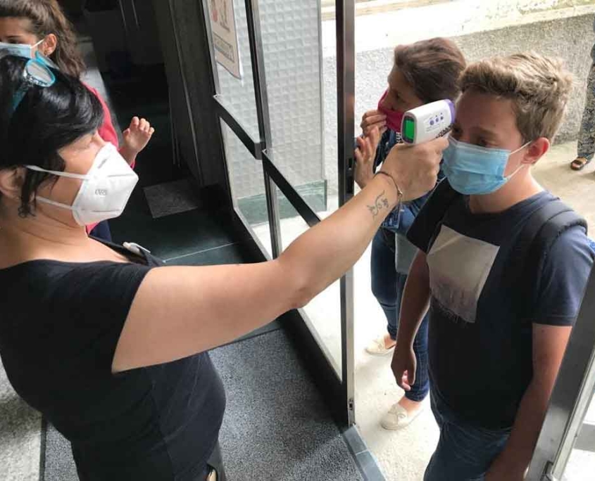 - Ogni famiglia è tenuta a misurare la temperatura corporea ai propri figli e a trattenerli presso l’abitazione se dovesse superare i 37,5°. A ulteriore tutela, all’ingresso a scuola, si rileverà la temperatura a tutte/i: di conseguenza, nel primo periodo non sarà consentito uscire dall’edificio durante lo svolgimento delle attività scolastiche.